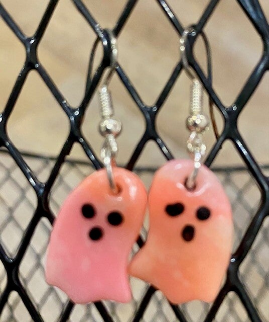 Handmade polymer clay earrings, neon pink & orange, & shaped like ghosts.